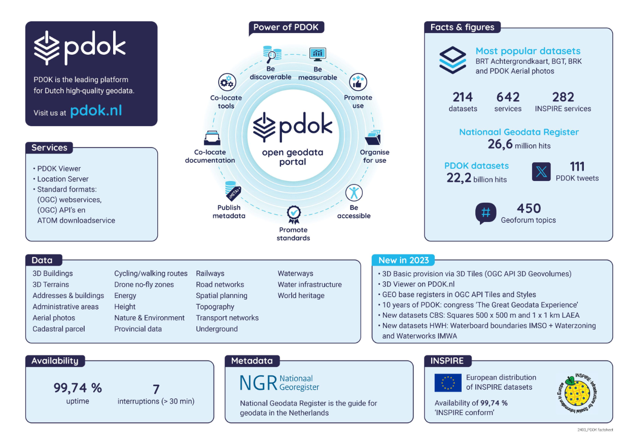 PDOK is in 2013 in eerste instantie tot stand gekomen als een samenwerking tussen de partners het Kadaster, de ministeries van Infrastructuur en Waterstaat, Binnenlandse Zaken en Koninkrijksrelaties en Economische Zaken en Klimaat, Rijkswaterstaat en Geonovum. Inmiddels is de governance gewijzigd; sinds 2018 exploiteert het Kadaster zelfstandig het dataportaal PDOK, in opdracht van BZK. Het Kadaster zorgt ervoor dat deze infrastructuur 24/7 beschikbaar is en een prima performance kent.