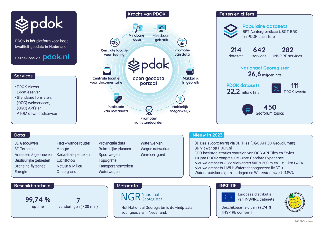 Het platform PDOK is een functionele, robuuste, betrouwbare voorziening met actuele geodata voorzien van goede metadatering. PDOK zorgt voor de geografische ontsluiting van de geo-basisregistraties en andere kern geodatasets zoals het Nationaal Wegen Bestand. De PDOK diensten voldoen aan nationale en internationale standaarden, waaronder de Europese INSPIRE standaard en de Nederlandse e-overheidstandaarden. Lees meer over de krachtBekijk het open geodata plaatje van dit open geodata portaal.